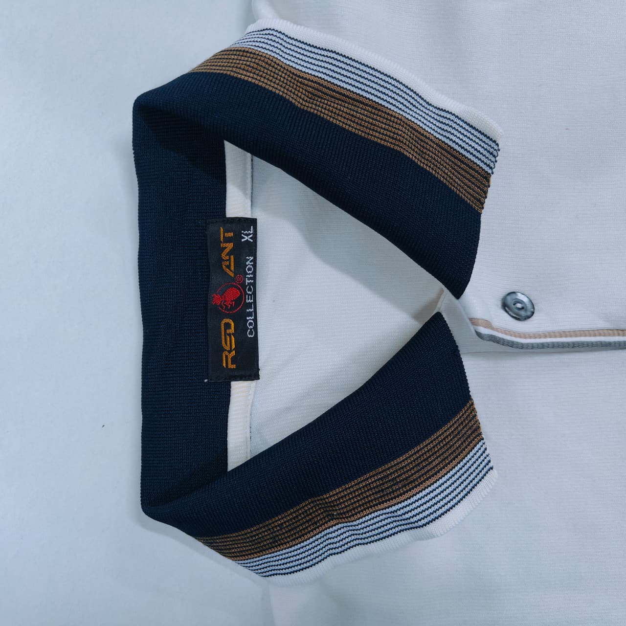 Contrasting Collar: A flat-knit ribbed collar in navy blue, featuring horizontal stripes in white and gold/brown for a sporty, sophisticated look.