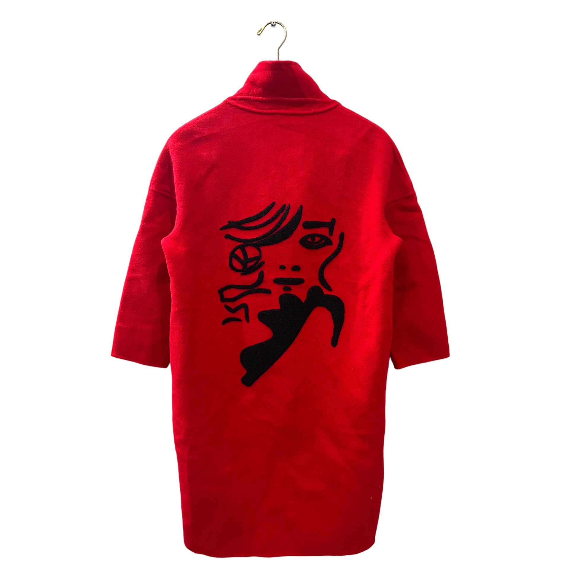 A red longcoat embroidered in a size Medium is a bold, statement-making piece. It moves away from traditional minimalism and leans into a more ornate, artisanal, or gothic-inspired aesthetic.